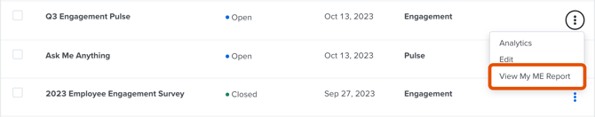 - The ME Report must be enabled in the Engagement survey setup, reach out to your CSM/CIM to enable the ME Report for your organization
