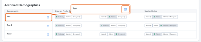 - In the Archived Demographics area, identify and click the archived demographic's corresponding unarchive icon to open a confirmation modal