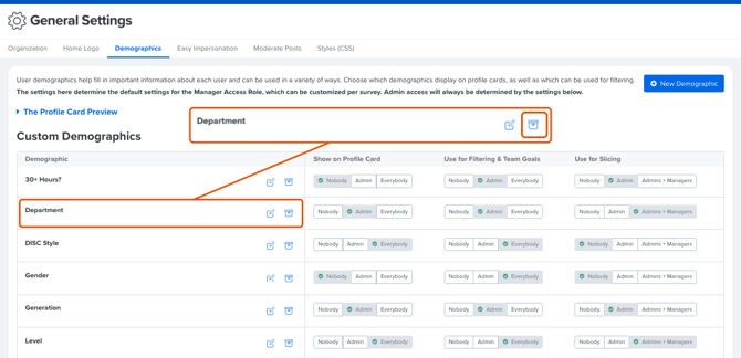 - In the Custom Demographics area, identify and click the demographic's corresponding archive icon to open a confirmation modal