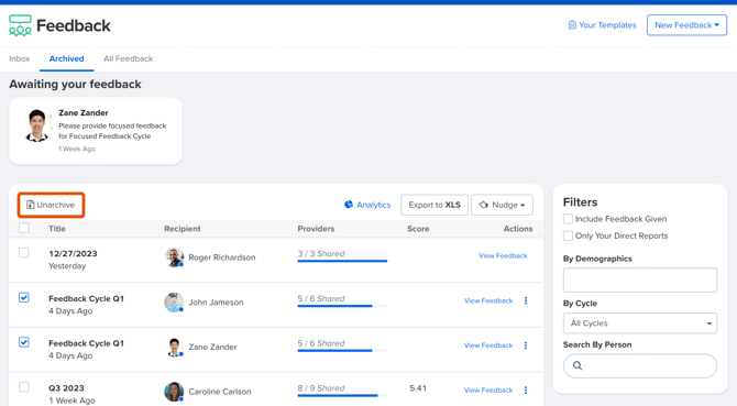 - Select the ☐ icon for each Feedback session to unarchive