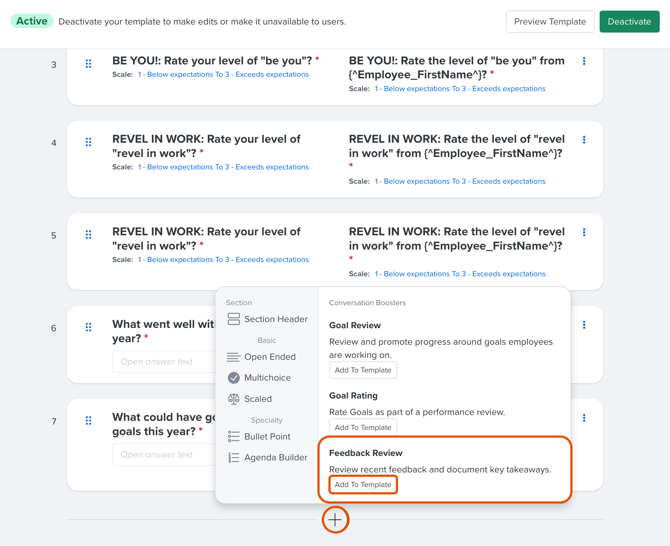 To add the Feedback Review Booster to a 1-on-1 or Performance Review template: