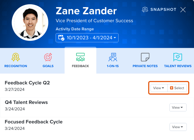Note: Only one Feedback cycle can be selected at one time - Click the x icon in the top-right to close the Snapshot