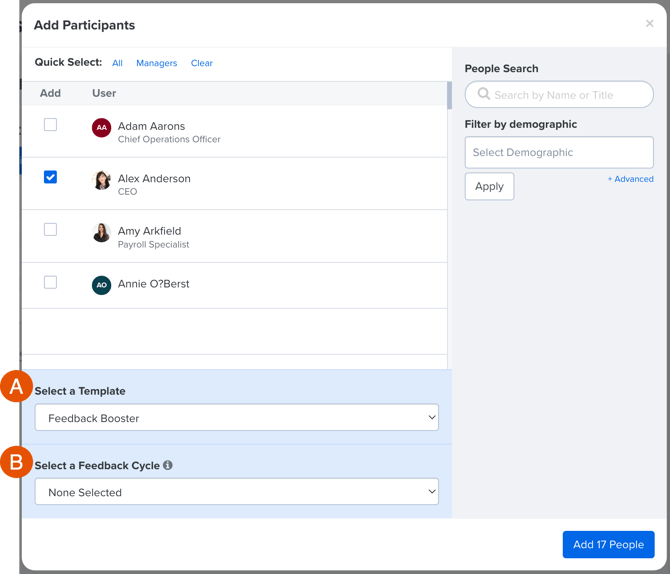 - Click and select the employees' corresponding ☐ icon to add them to the cycle