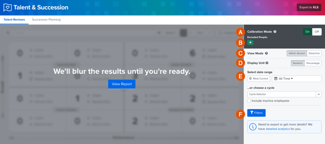 Click Off to disable Calibration Mode and return to the default Talent Review Analytics view.