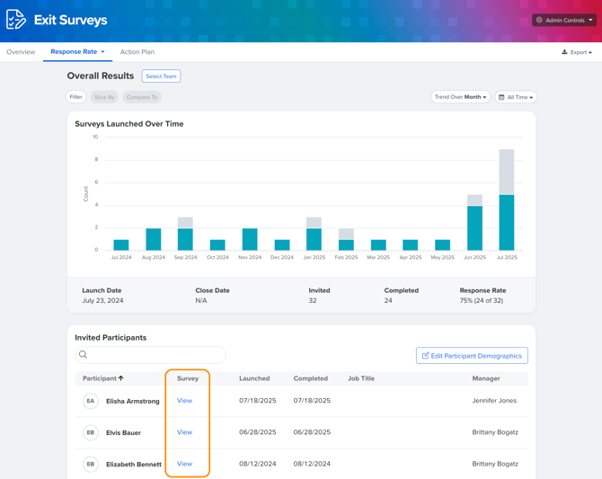- From the non-confidential survey's Response Rate report, click View for the survey participant