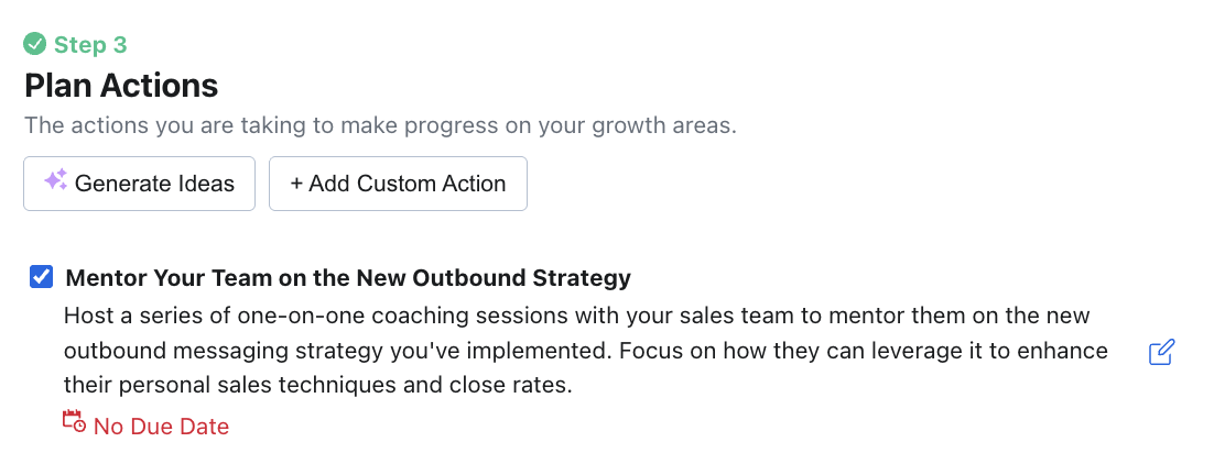 - By clicking Add Custom Action, prompts will help you define your own action items. Once you're done, click Save to add them to your Growth Plan.