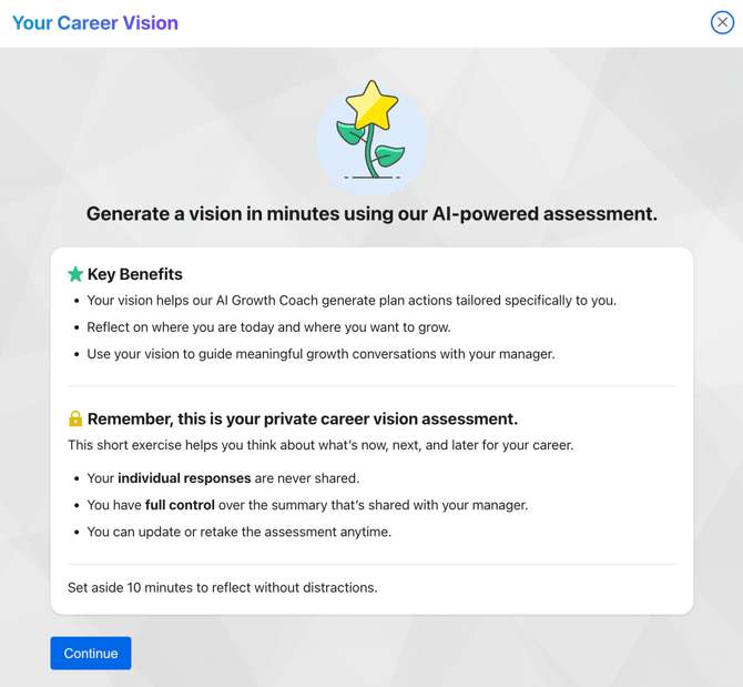 This Career Vision is entirely your individual journey, and this assessment won't be directly shared with HR or managers. Once you've completed all steps in creating your Growth Plan, you can then share the overall plan with your manager for support.