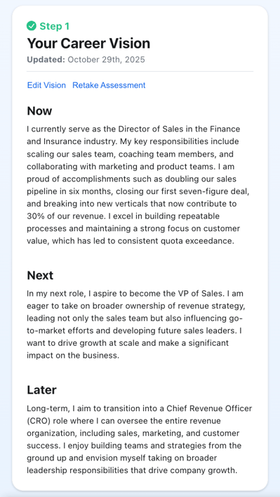 From here, your personalized Career Vision will be generated based on your responses to the assessment. Including a vision for now, next, and later, your career aspirations have never been clearer.