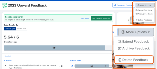 If your organization has enabled user-initiated Feedback, you can delete Feedback sessions that you have requested via the Request Feedback function.