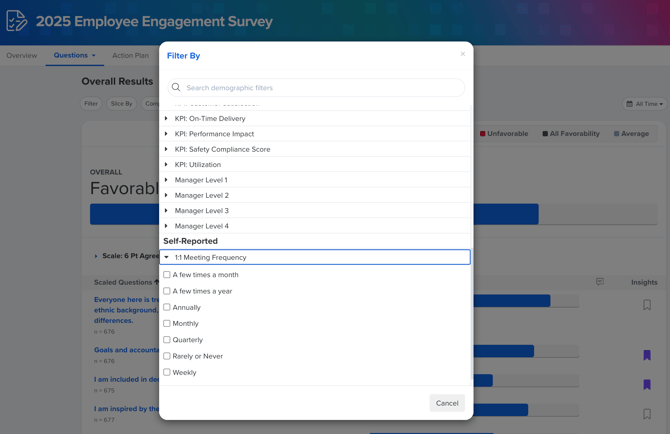 Single-choice questions allow participants to self-report demographic data that isn’t already tracked in Quantum Workplace. Slicing and filtering by single-choice questions is particularly useful when using public survey links or inviting non-employees, as these participants don’t have pre-existing demographic data in the system.