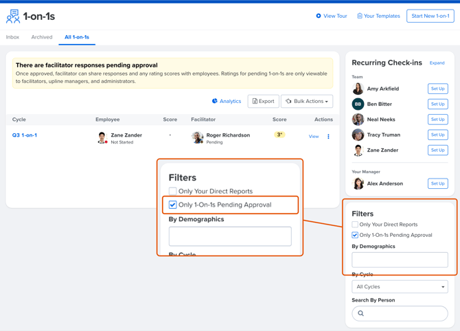 - Click and toggle Only 1-on-1s Pending Approval filter the results to only show pending 1-on-1s