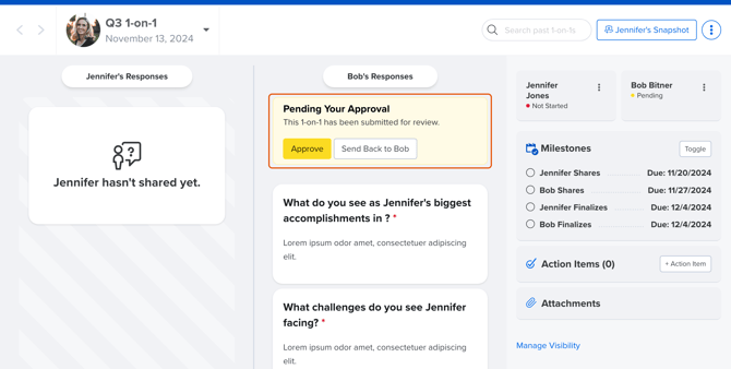 As an admin, set up a 1-on-1 cycle to require Facilitators to submit their 1-on-1 responses for approval before they're shared with the Employee. Use this setting to allow additional oversight into important and sensitive 1-on-1 conversations.