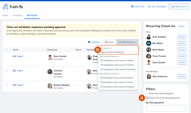 Admins and upline managers, if enabled, can approve all pending 1-on-1s in bulk.