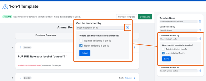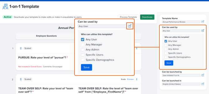 - A user with access to a template can launch a 1-on-1 with a user who was not added as a Specified User