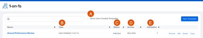 As an admin, create and manage templates for user-initiated and admin-initiated 1-on-1 cycles. Manage if a template is available for user-initiated and/or admin-initiated cycles, and which users can use the template.