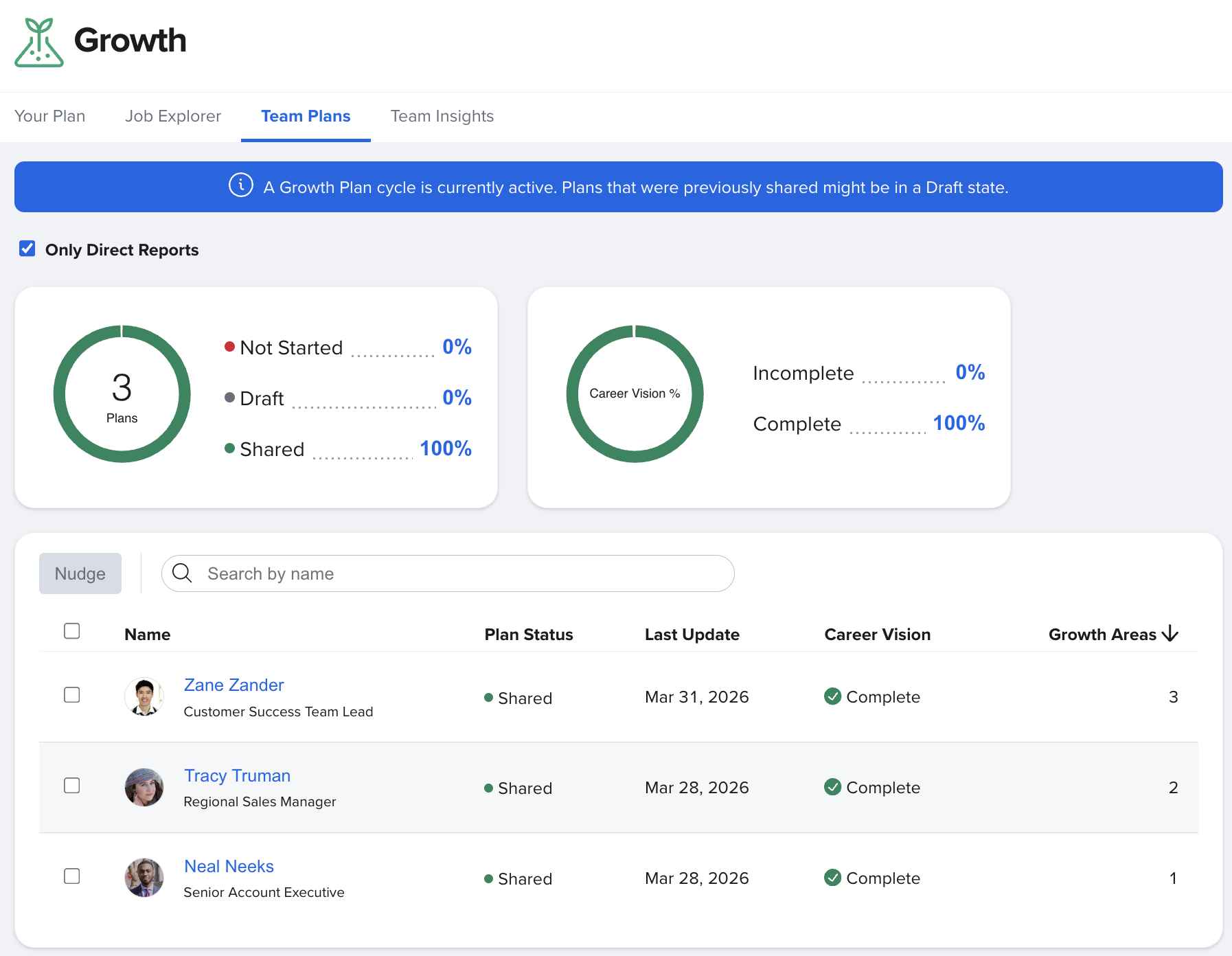 - Under Team Plans, you’ll see a visual of each direct report’s progress toward their Growth Plan. To dive deeper into individual Growth Plans, click by employee name.