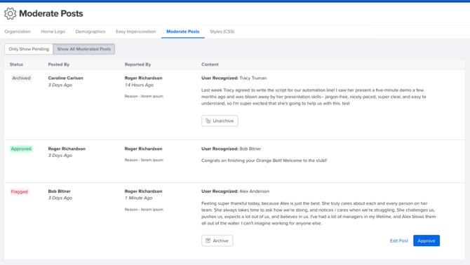 As an admin, view and moderate Recognition and Goal posts that have been flagged by an employee.