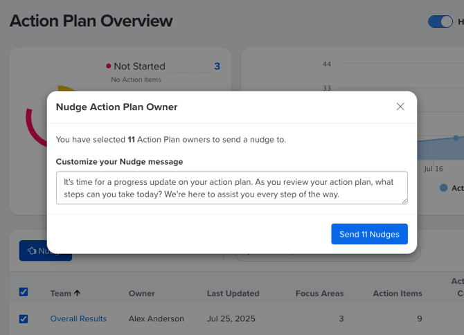 Nudge Action Plan Owners to send an email notification and an in-app notification with customizable nudge messages to encourage regular updates and progress.