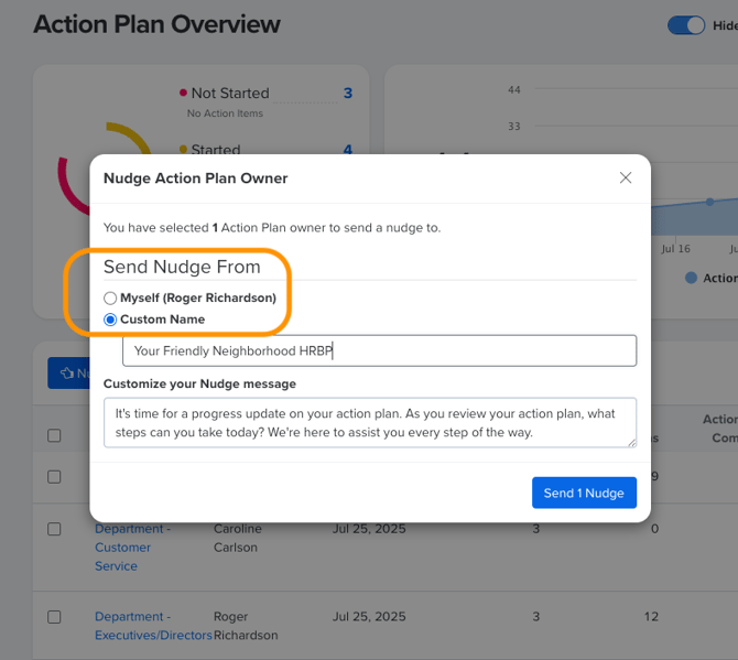 - As an admin, you can send the nudge from either yourself or a custom name, e.g. HR Dept., Employee Success, etc.