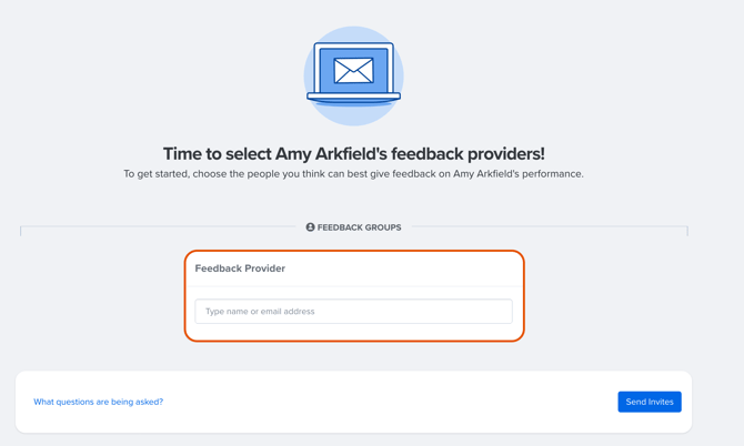 If the Feedback template for the Feedback cycle does not have Feedback Groups configured, users invited to select Feedback Providers can add and invite any user to provide feedback.