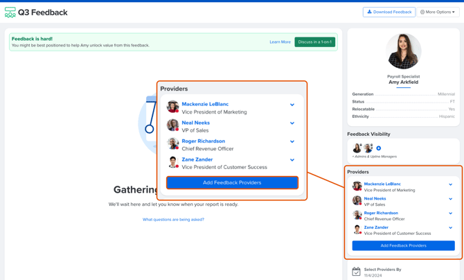 If the Feedback template for the Feedback cycle includes Feedback Groups, the suggested Providers, based on the reporting relationship in the Org Tree, are automatically added. Verify and add additional Feedback Providers as needed.