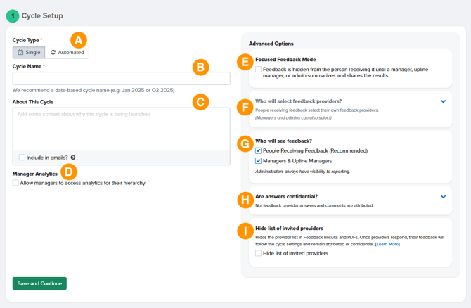 - B. Cycle Name: Enter the name of the Feedback cycle