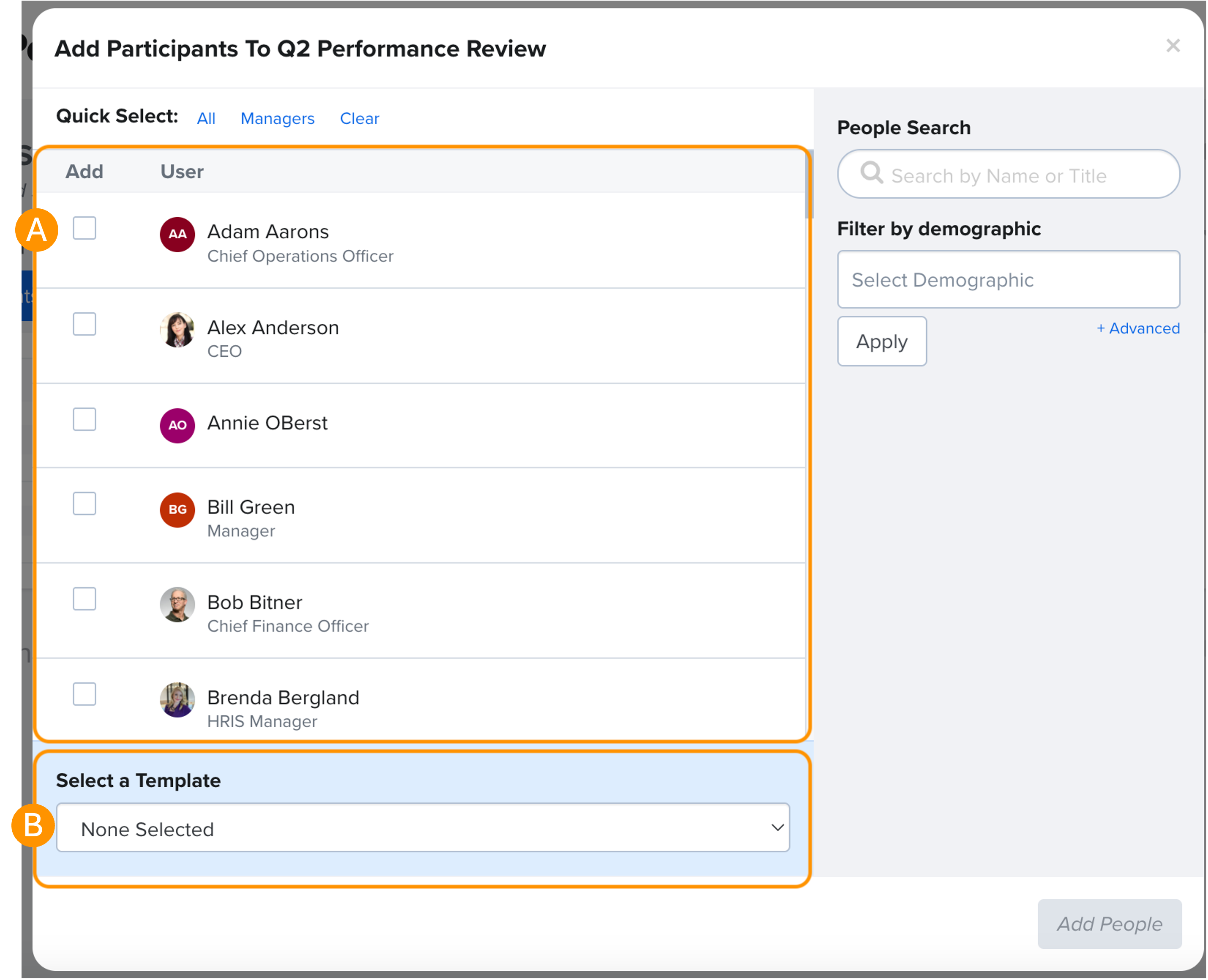 - Optionally, use the Quick Select function to easily select either all employees or all managers within your organization