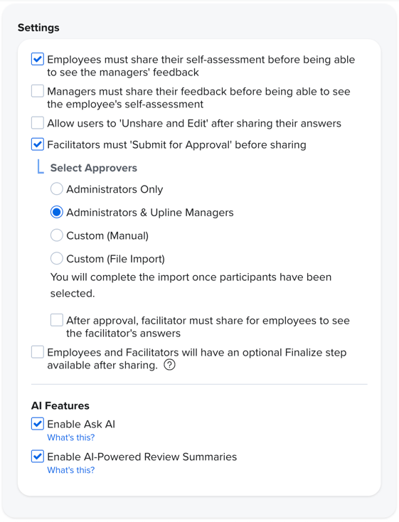 - If Facilitators must 'Submit for Approval' before sharing is selected, responses from the manager/facilitator require an admin to approve the response before the employee is notified and able to view the response
