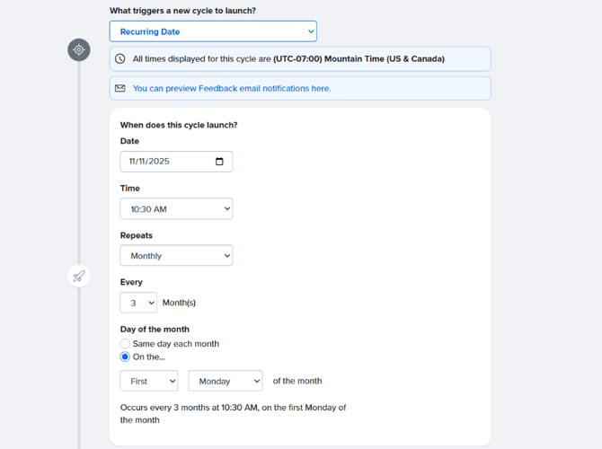 - Recurring: Cycle launches regularly, i.e. biweekly, monthly, quarterly, etc. relative to a specified date.