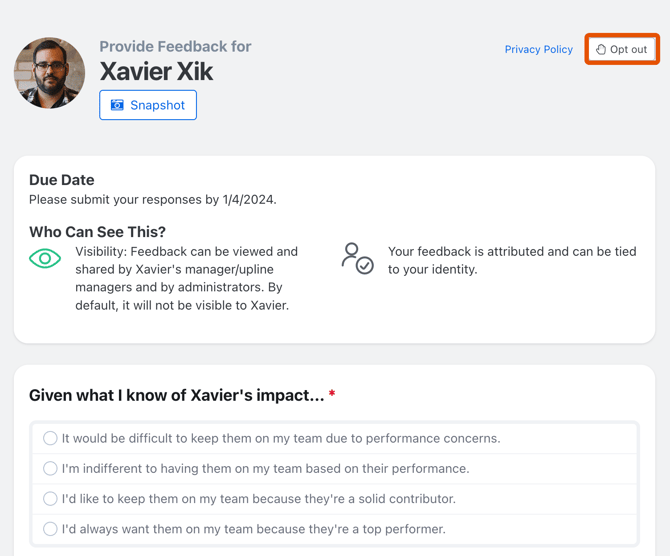 If the Feedback is part of a cycle with a minimum response threshold, opting out reduces the total number of Feedback Providers who could have responded.