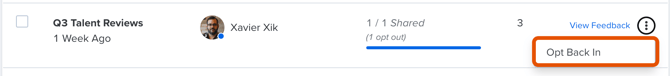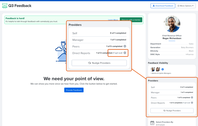 For example, if a Feedback cycle invites four Feedback Providers and one user opts out, the updated list of Providers will reflect that three Providers were invited and that one user opted out.