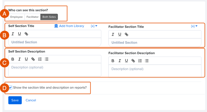 - Specify if the section header should apply to the employee, facilitator, or both (Figure A)