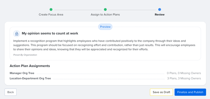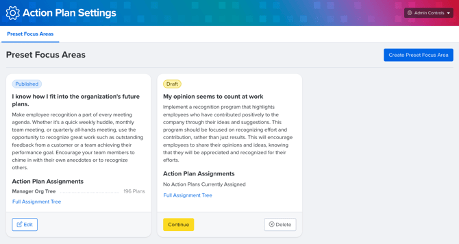 Preset Focus Areas, both published and drafts, can be found on the Action Plan Settings page.