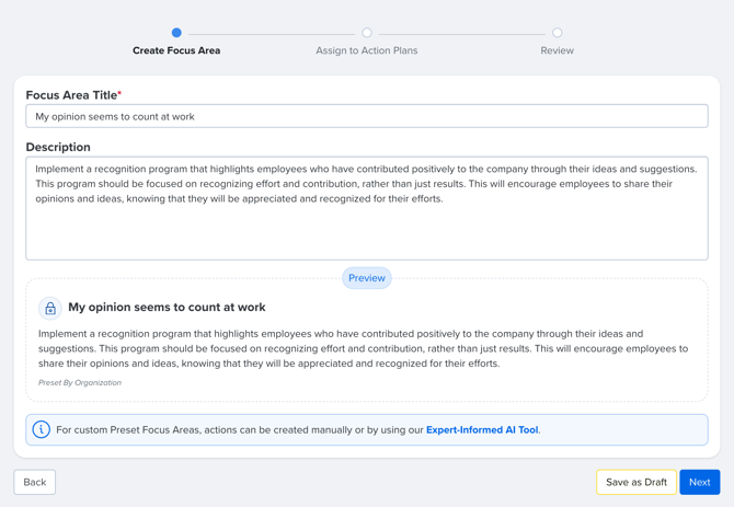 Preset Focus Areas are created and managed in the survey's Action Plan settings page.