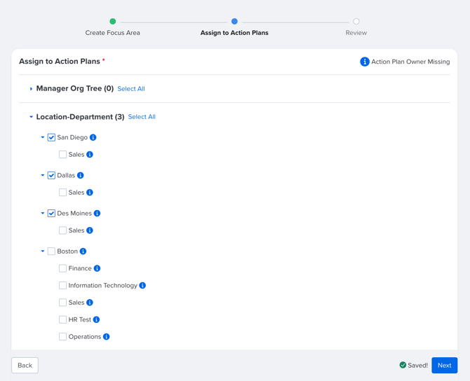 - On the Assign to Action Plans step, use the survey's active org trees to specify which branches or downlines will see the Preset Focus Area, and click Next