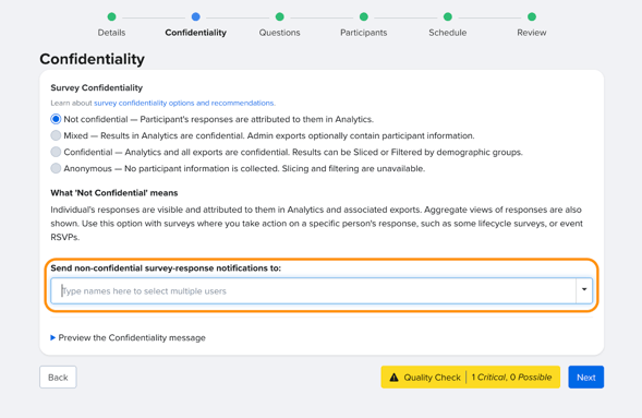 - Description: The Not Confidential option ties survey participants directly to their responses and comments by name within the survey's analytics.