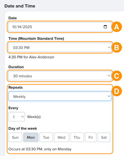 - Click Add Date and Time to configure the date, duration, and cadence as it will appear in email notifications and invites