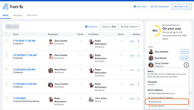 - In the Recurring Check-ins card, click the⋮ icon for the corresponding recurring 1-on-1 participant