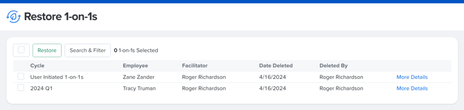 All deleted 1-on-1s are listed on the Restore 1-on-1s page.