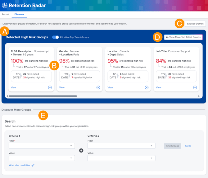- D. Top Talent Groups: When available, you can sort Detected High Risk Groups to surface these “Top Talent” groups first, helping you quickly focus on turnover risk among critical employees.