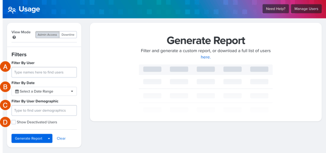 - D. Deactivated Users: Toggle to include/exclude deactivated users in the report