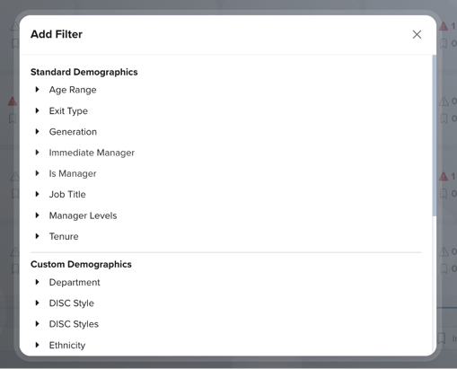 - Filters: Click to view and select various filters or demographics to apply to the results